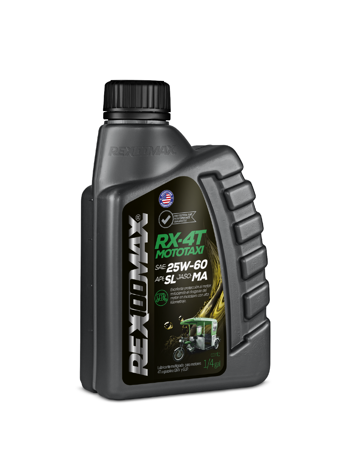 RX4T MOTOTAXI 25W-60 de Rex100Max es un aceite mineral de alto desempeño para la lubricación de motores de 4 tiempos accionados a gasolina, GNV y GLP formulado con aceites básicos y avanzada tecnología en aditivos para garantizar una excelente protección al motor, la transmisión y embragues.